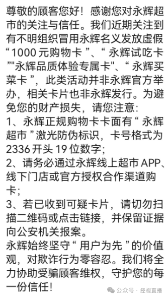 永辉超市向新民晚报表示,近期关注到有不明组织冒用永辉名义发放虚假“购物卡”“试吃卡”等,此类活动并非永辉官方举办,相关卡片也非永辉发行。