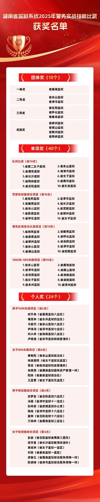 经过激烈比拼,最终雁南监狱荣获团体一等奖,赤山、津市监狱获团体二等奖,岳阳、怀化、娄底监狱获团体三等奖。其他奖项也花落各家。