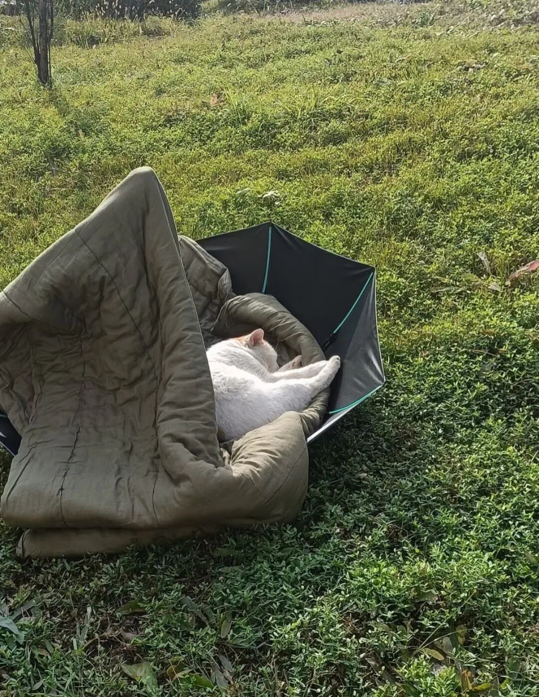 也有网友提醒“要小心!”因为用伞晒被子会收获“小猫严选”