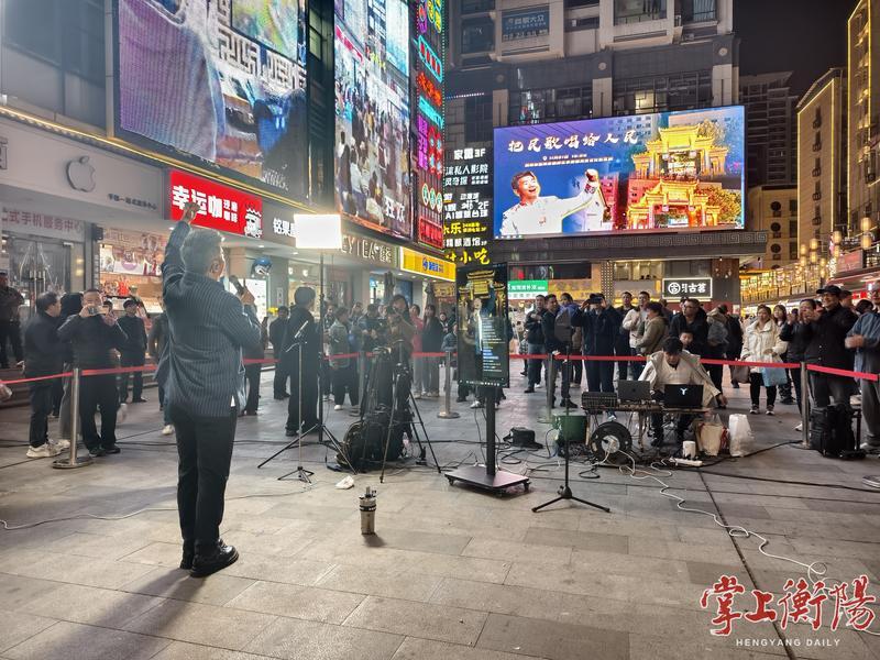 11月21日晚7时,衡阳市府路美食文化街区的烟火气里,突然撞进一阵高亢嘹亮的陕北腔调——一级演员、陕北民歌传承人杜朋朋《把民歌唱给人民》公益巡演,在此激情开唱。在旁边休闲散步的市民渐渐围拢过来,一场一小时的民歌盛宴,让美食街的夜晚多了份非遗韵味。