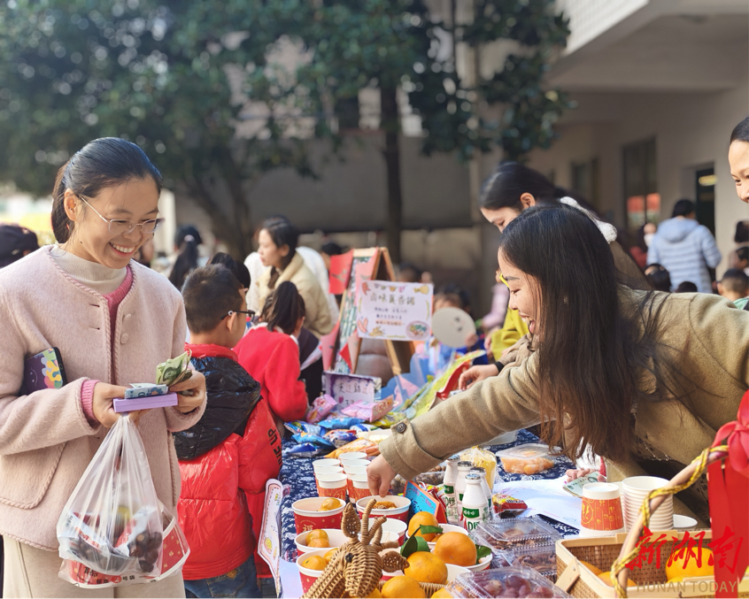 表演区域掌声不断,各班学生轮番登场,歌舞、古筝、武术等节目精彩纷呈。在各班展台之间,“物物交换”活动开展得热火朝天。孩子们认真介绍自己的作品,用劳动成果换取心仪的物品,在交流中体验着分享的快乐。