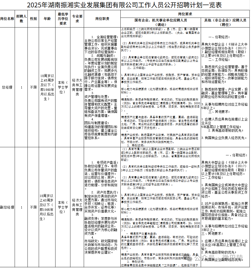 湖南振湘实业发展集团有限公司公开招聘高管人员的公告