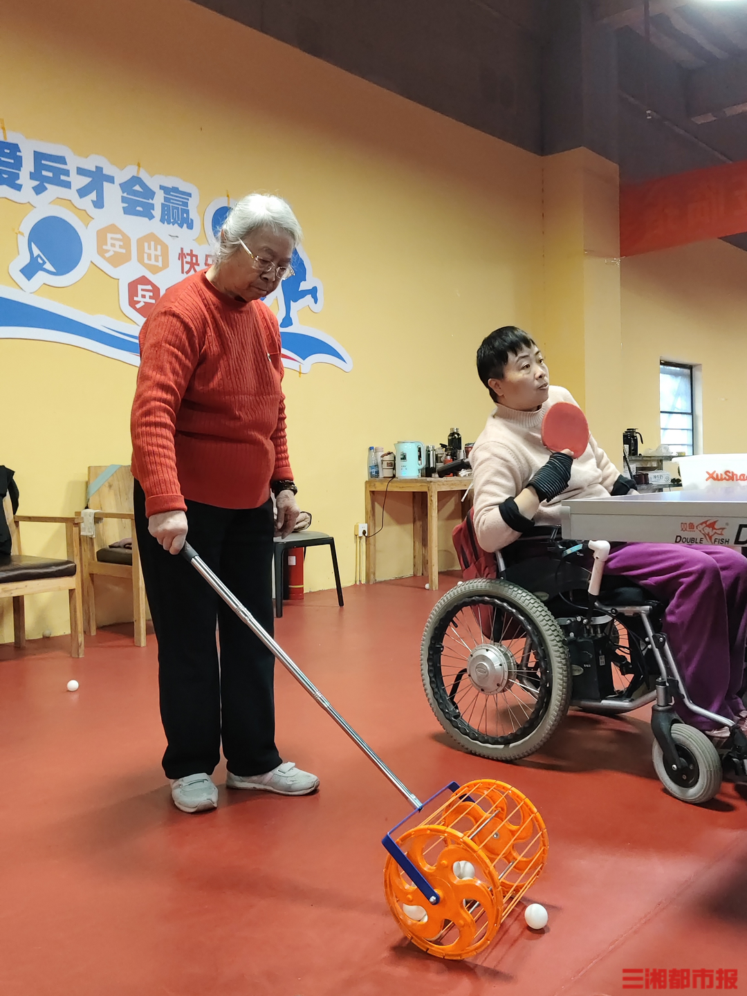 “哗——”,球拍划过空气的声响里,阎海英完成一次又一次挥拍,湖南省残联乒乓球教练包涛正守在一旁,偶尔纠正她的动作。