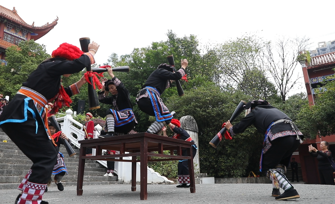 文艺汇演涵盖群舞、民歌联唱、音乐情景剧等多种形式,通过不同篇章立体展现江华的历史文化与新时代风貌。其中,男女群舞《八仙桌长鼓舞》极具亮点,它将国家级非物质文化遗产瑶族长鼓舞与地方特色八仙桌相结合,舞者在桌面腾挪翻转,鼓声时而急促如雨,时而舒缓抒情,既彰显了表演的高难度与技巧性,更象征着瑶族文化在历史长河中的坚守与传承。