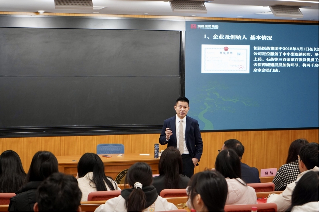 (图为湖南恒昌医药集团江琎董事长创业经验分享会)