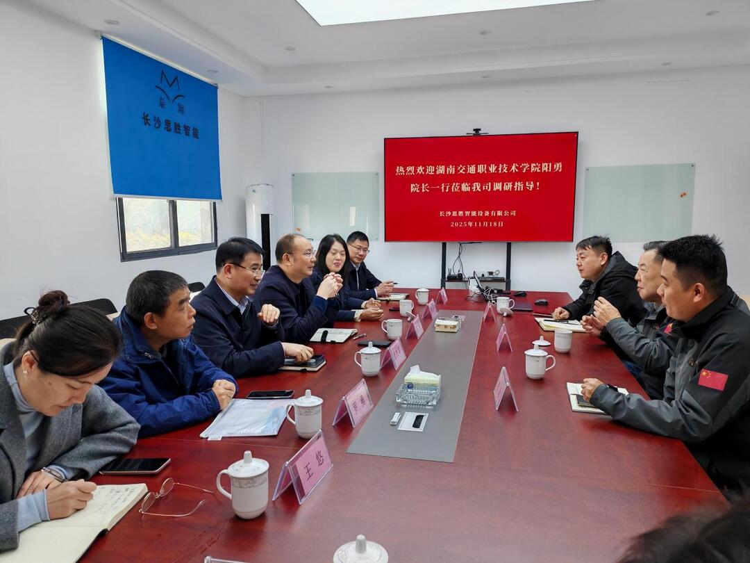 为进一步推进产教融合、校企合作,精准对接行业需求,提升人才培养质量与科研服务能力,11月18日,湖南交通职业技术学院院长阳勇,副院长唐杰军、褚凤,教务处、科研规划处、机电工程学院负责人与骨干教师代表一行,前往长沙思胜智能设备有限公司开展实地调研与合作洽谈。