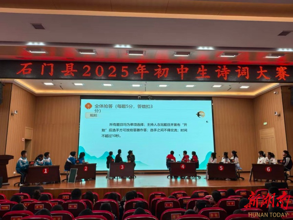 据悉,本次大赛由石门县教育局主办,中国共产主义青年团石门县委员会、湖南省新华书店有限责任公司石门县分公司协办,湘佳永兴学校承办。赛事自启动以来,吸引了全县初中学校的积极参与。初赛选拔出的12支队伍在复赛中分为两组竞技,最终每组前三名晋级下午的总决赛。比赛设置必答、抢答、飞花令等环节,全面考察选手的诗词储备、理解能力与临场反应。