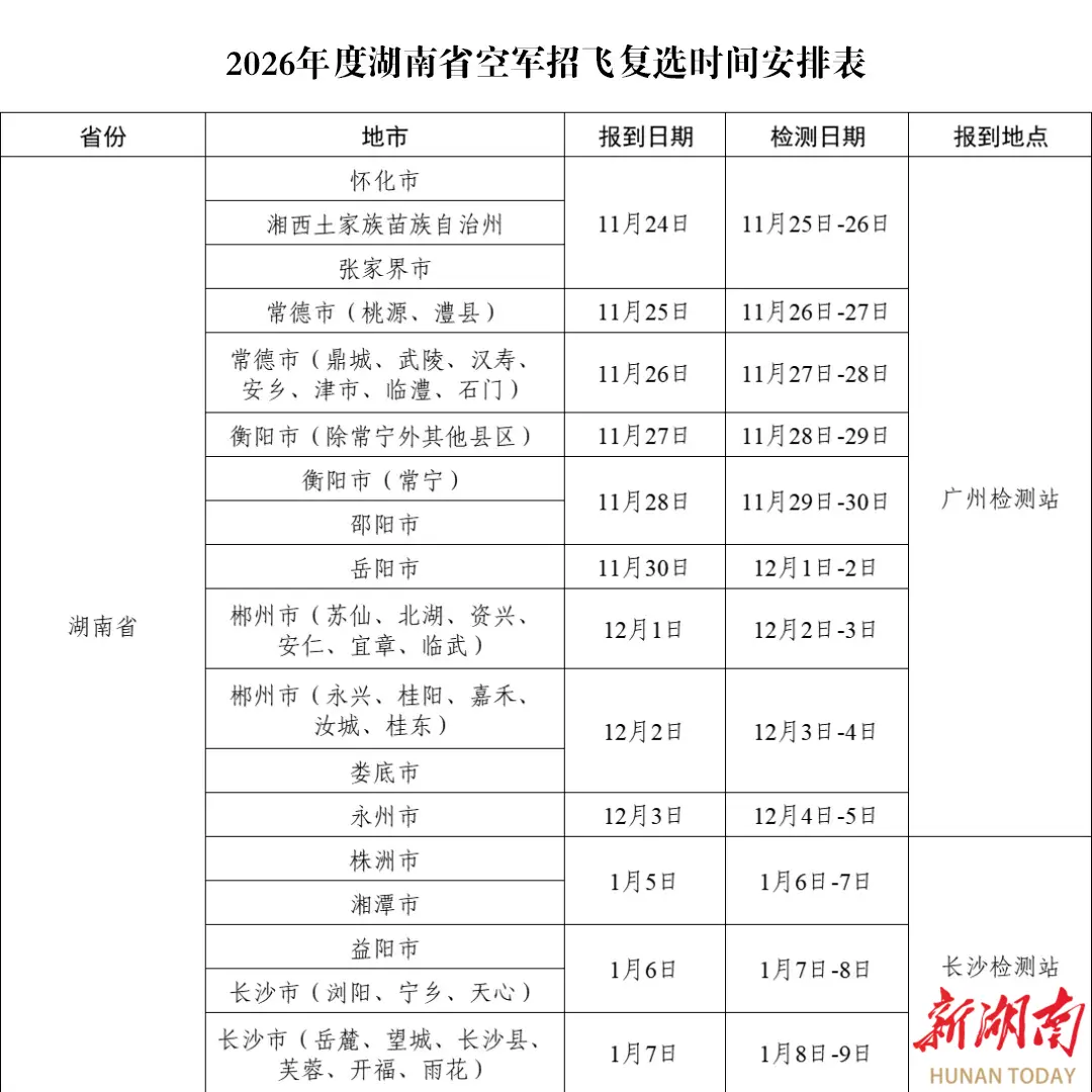 湖南日报11月25日讯(全媒体见习记者 沈可心)有志于翱翔蓝天的同学们请注意!今日,记者从南部战区空军招飞获悉,2026年度空军招收飞行学员复选检测已正式启动。本次复选将分两个阶段进行:2025年11月24日至12月27日 以及 2026年1月5日至1月9日,并在广州、长沙两地设站,组织湖南、湖北、广东、广西四省(区)的考生参检。湖南省初选合格且文化成绩优异的学子,将作为首批对象参加本轮检测。具体安排如下,快来了解!