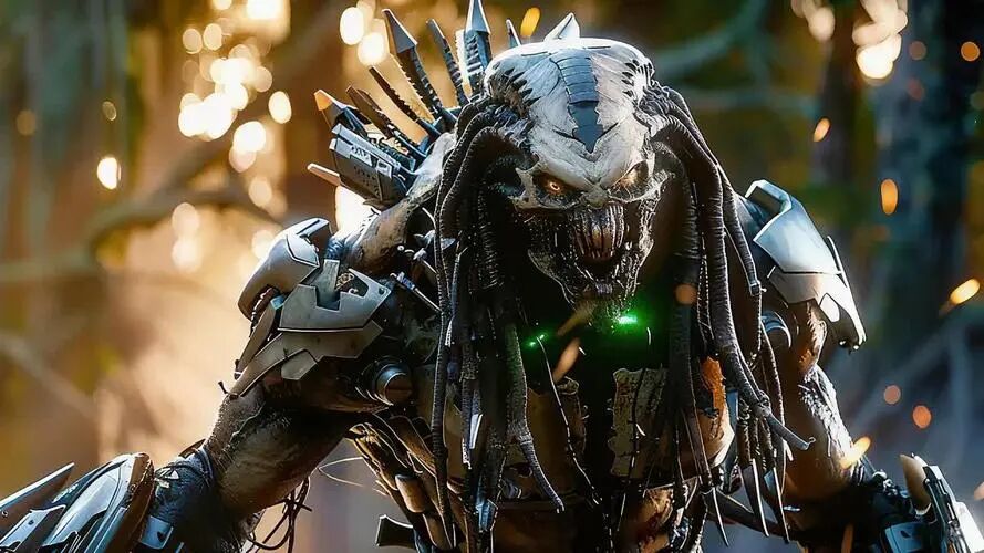 这种“反套路”的主角设定,让冰冷的外星猎手有了滚烫的情感内核。他内向敏感,渴望认同却不盲从族群的“强者法则”;而只剩上半身的仿生人希雅,带着“找回完整自我”的执念与他结盟,两个“残缺者”相互救赎,让跨物种羁绊显得真实又动人。更妙的是反派蚀煞的塑造,从“无坚不摧的杀戮机器”到“为幼仔奋不顾身的守护者”,怪兽的柔情一面不仅让角色立体,更让影片从“单纯狩猎”升华为“关于守护与成长”的深层故事。
