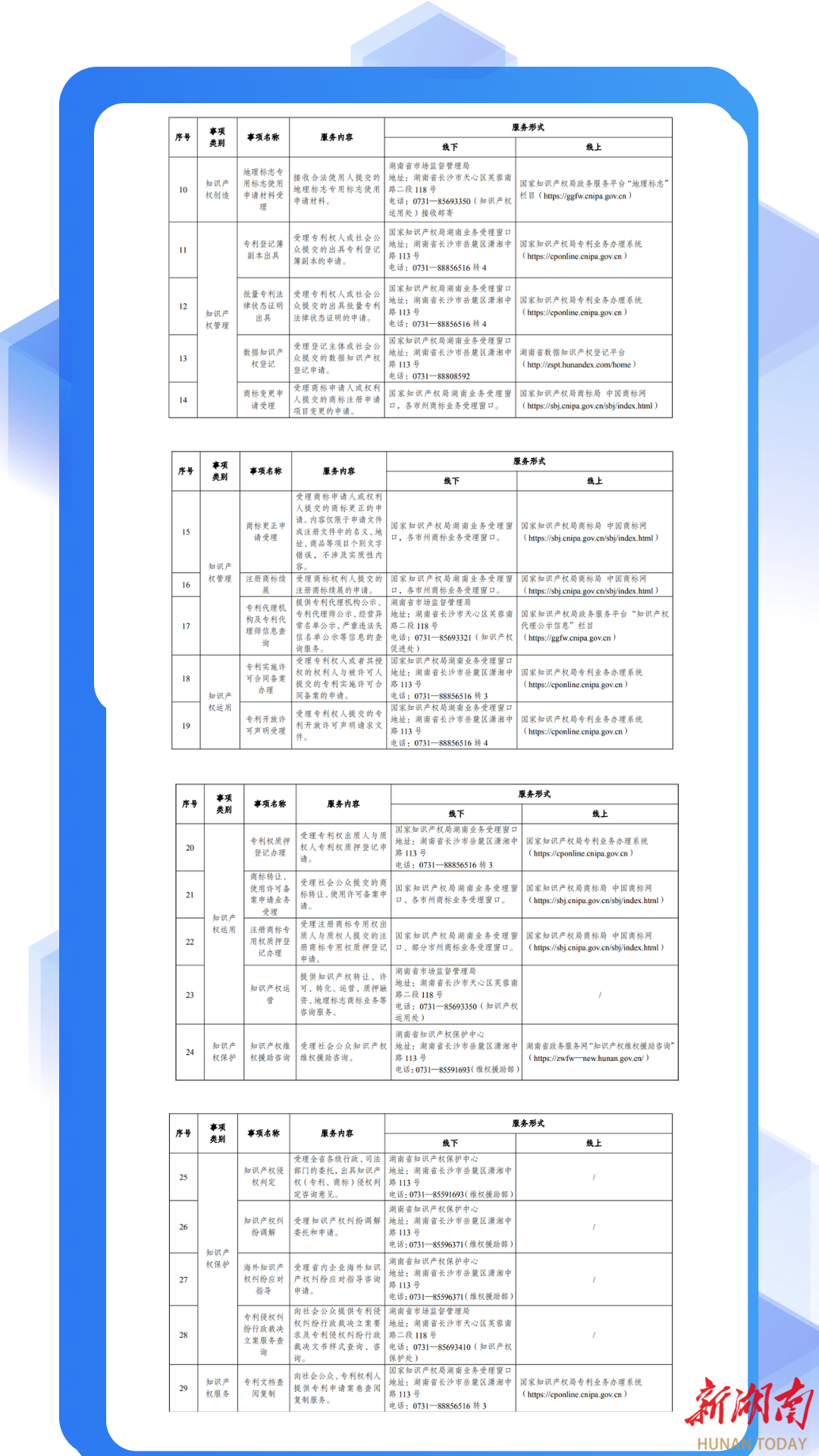 湖南日报·新湖南客户端11月24日讯(全媒体记者 李成辉)近日,湖南省知识产权局印发《湖南省知识产权公共服务事项清单(第二版)》(以下简称“省级清单”)和《湖南省国家级知识产权公共服务机构公共服务事项清单(第一版)》(以下简称“国家级清单”),以正面清单形式,统一向社会公开标准化、规范化的知识产权公共服务内容,旨在更有效地引导社会公众和创新主体便捷、高效地获取相关服务。