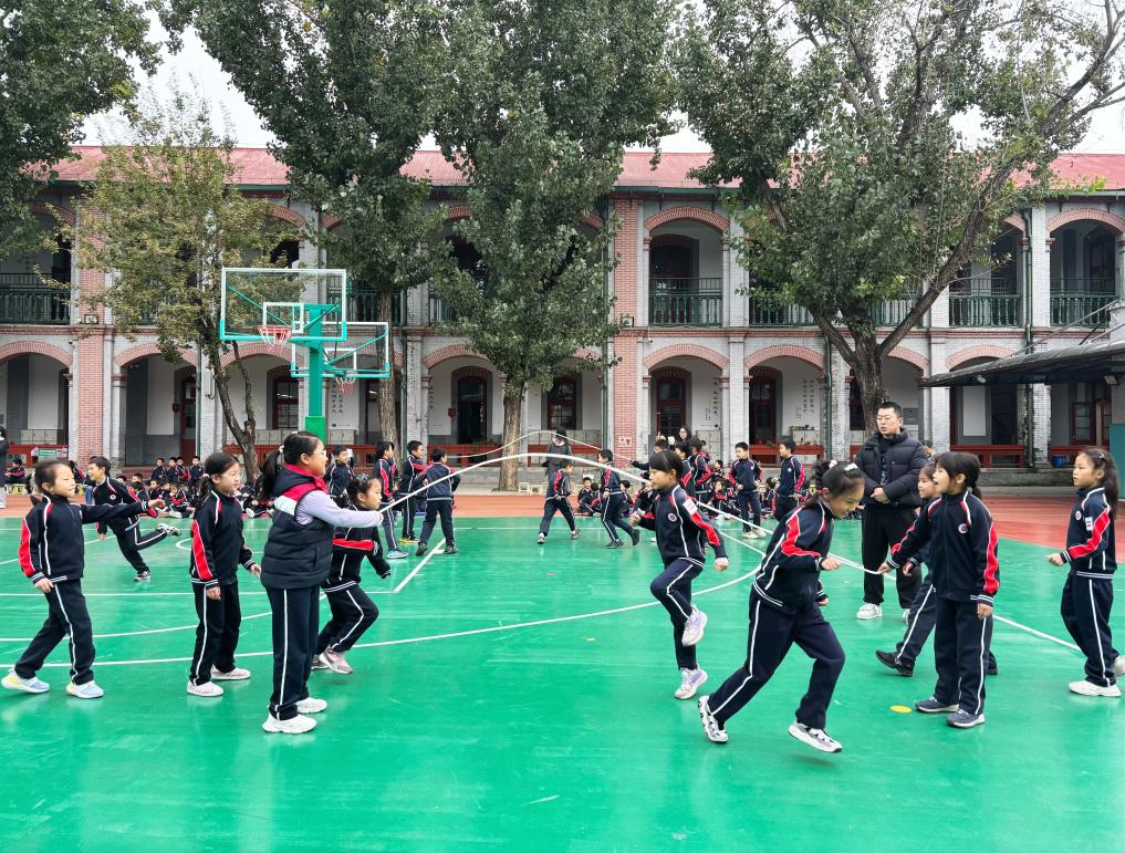 步入京华实验学校,跳绳的孩子们站满了整个操场,跃动的青春与古朴的教学楼相映成趣。在这场全校规模的跳绳大赛中,一、二年级学生为高年级学长学姐连贯的双绳花式跳惊呼连连;高年级学生则为学弟学妹们上场参赛加油鼓劲。