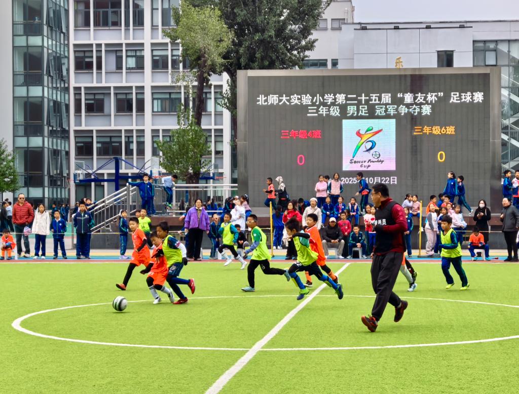 午后,暖阳洒在黄城根小学的绿茵场上。经过一个多月的较量,校内“班超”联赛迎来“巅峰对决”。三年级1班与16班上场争冠,呐喊声、擂鼓声一浪高过一浪。带球、抢断、传球,碰撞、摔倒、爬起——孩子们动作略显稚嫩,但拼劲动人心魄。