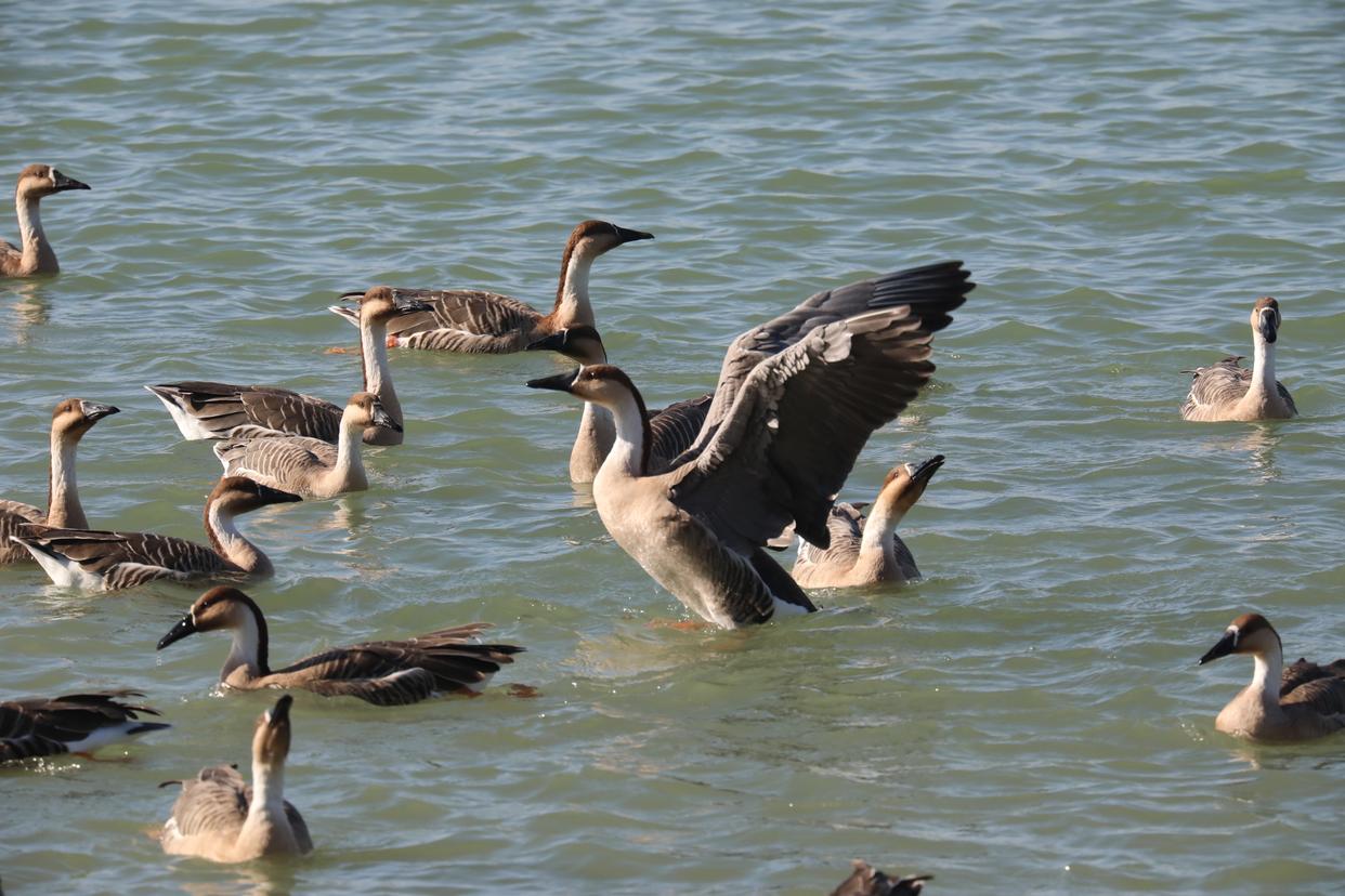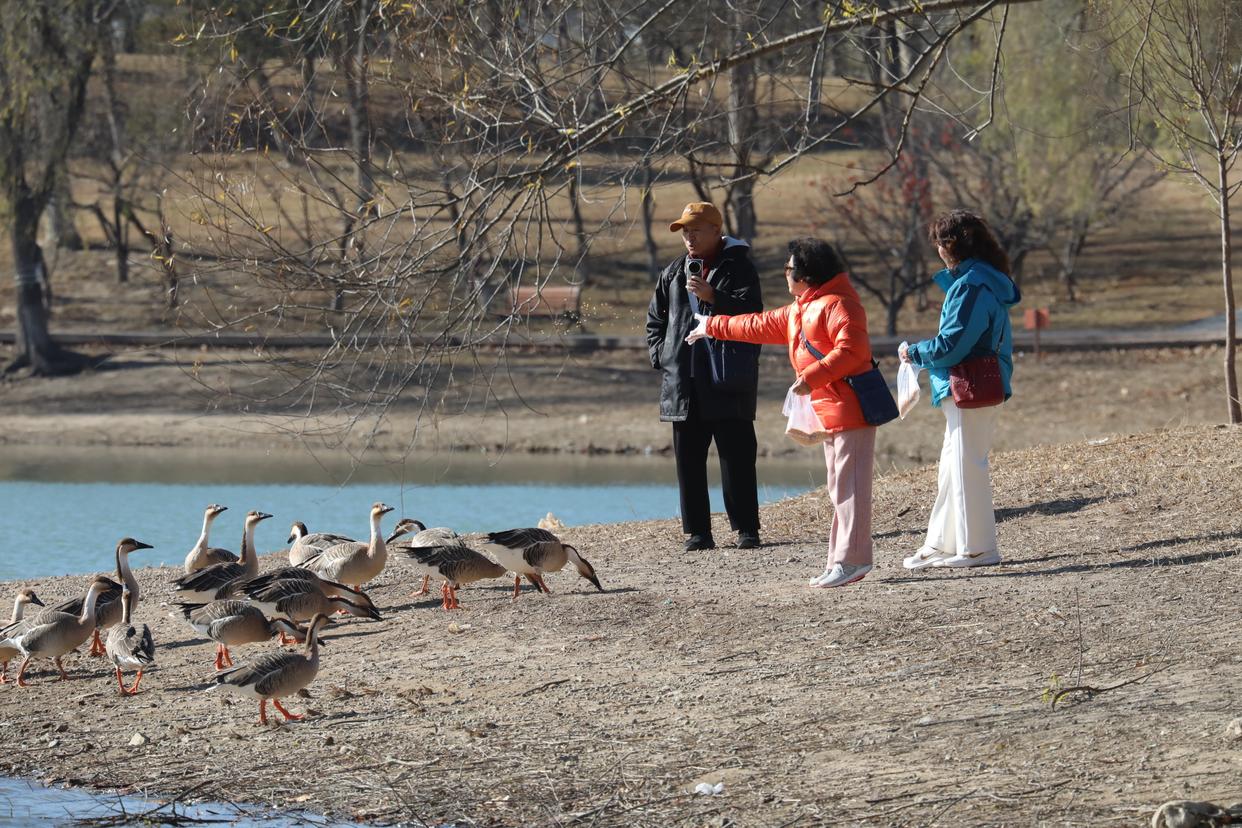 清晨的暖阳初升,雁鸣渐起。部分鸿雁栖息在湖心岛的芦苇丛中,看到游人的到来后,不少胆大的游往岸边徘徊,与投喂的游客温柔互动。呈现出一幅人与自然和谐相处的画面。