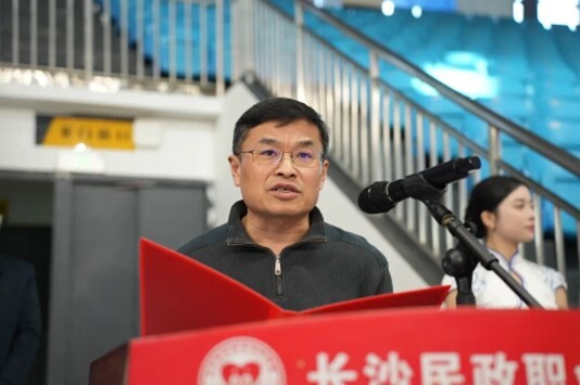 李斌在欢迎辞中对各位领导、嘉宾及全体参赛师生的到来表示热烈欢迎,并向为赛事付出辛勤努力的工作人员和志愿者致以衷心感谢。李斌介绍了长沙民政职院构建的“四维体育文化体系”以及“周周有活动、月月有比赛、人人能参与”的校园体育生态,特别是学校男篮十年内八次夺得全国冠军的辉煌成绩。他承诺,长沙民政职院将精心组织、周密安排,确保赛事顺利举行,并以此为契机,进一步将体育精神融入育人全过程。