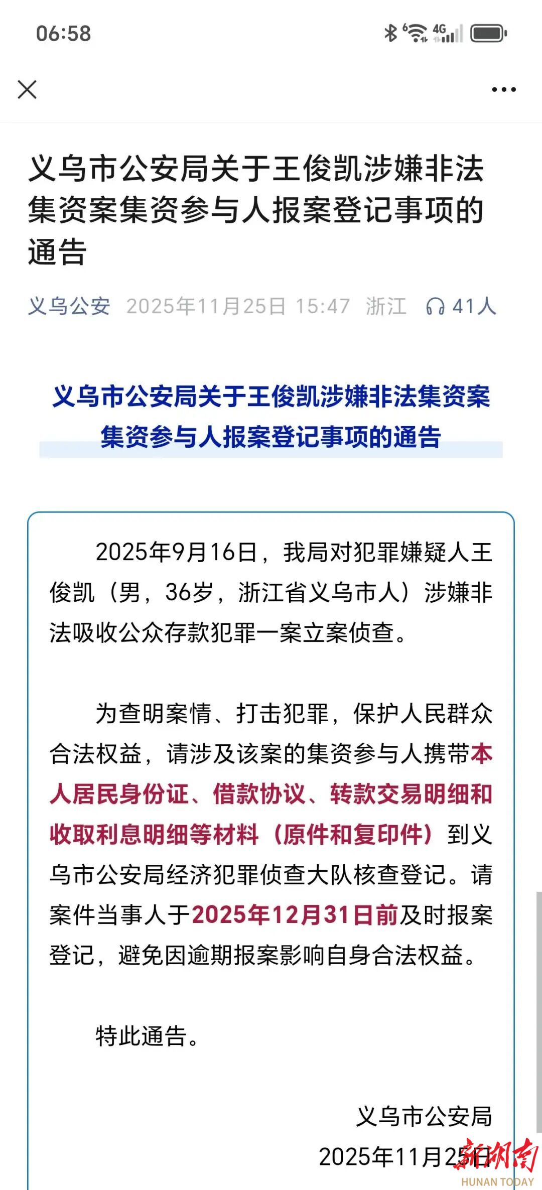 11月25日,义乌市公安局发布通告,标题为《义乌市公安局关于王俊凯涉嫌非法集资案集资参与人报案登记事项的通告》。