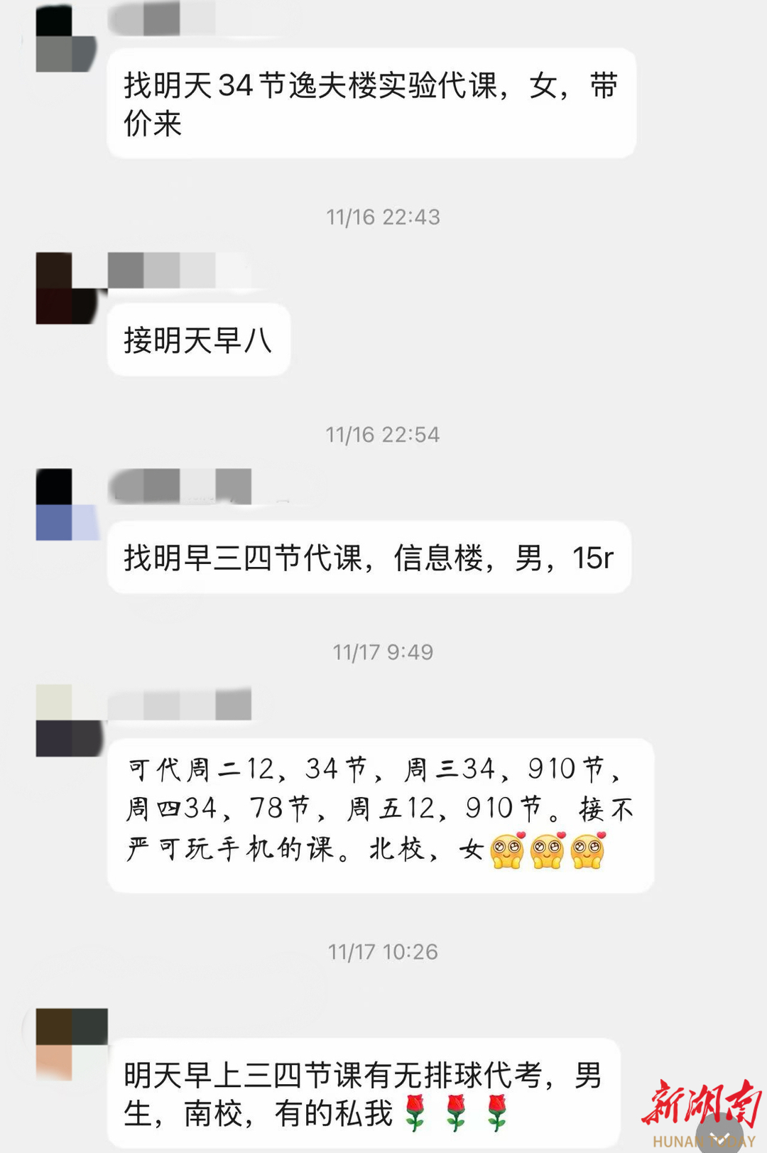 在一些以“互助”为名的交流群中,代课交易自由进行:“南校区27号下午234节课找代课,女,带价来”——类似的信息层出不穷。