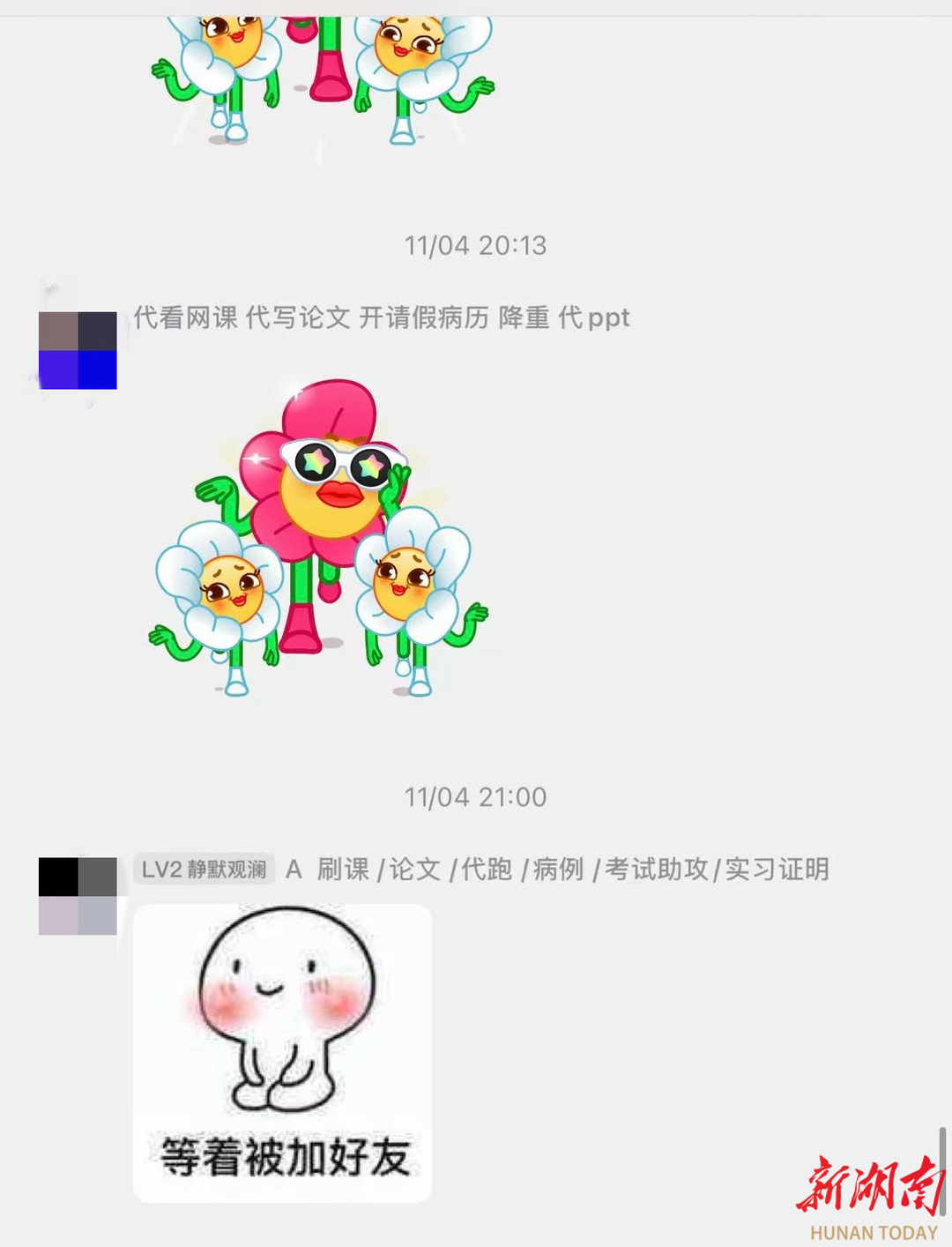 交易信息主要通过校园群聊、校园墙和校内集市等平台流通。小雯向记者展示其所在新生QQ群时,可见不少群昵称后清晰标注着“代看网课、代写论文、开具假条、代做PPT”等服务项目,甚至连迎新群群主的主页背景也布满此类广告,点击即可直接联系。