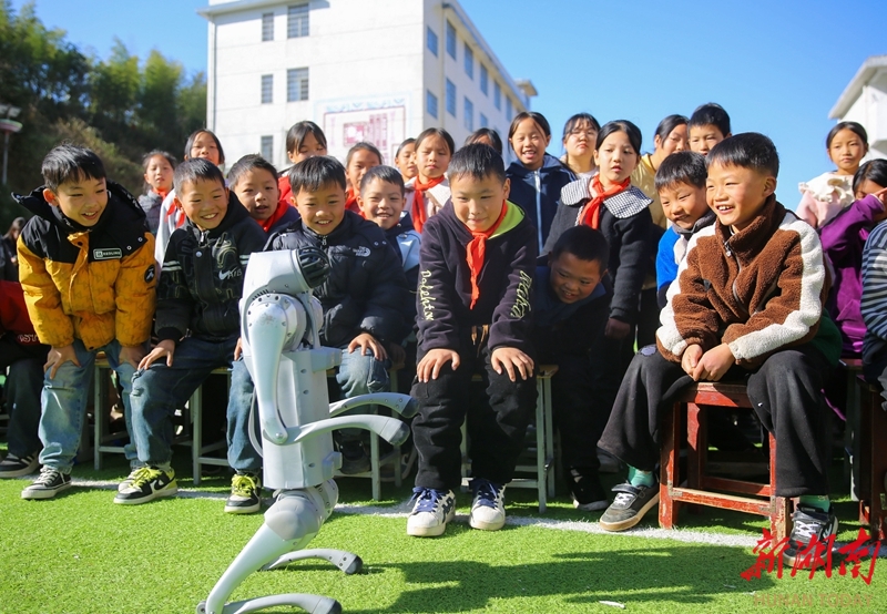 11月27日,隆回县虎形山瑶族乡九年义务制学校,孩子们与机器狗互动。今年以来,隆回县科协联合多部门组织青少年科技创新名师工作室117名教师,定期到农村及边远学校开展“百名院士进校园、万名科技工作者上讲台”科技送教活动,通过科普活动、示范课、讲座等形式,为乡村学校送去科技教育新理念和新方法,促进城乡教育均衡发展。曾勇 陈勇 摄影报道(湖南图片库)