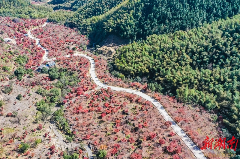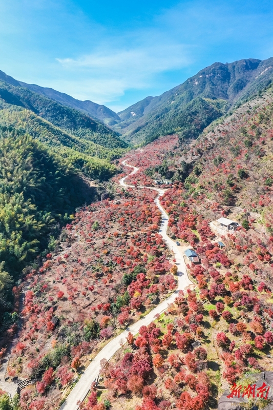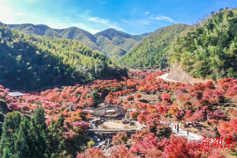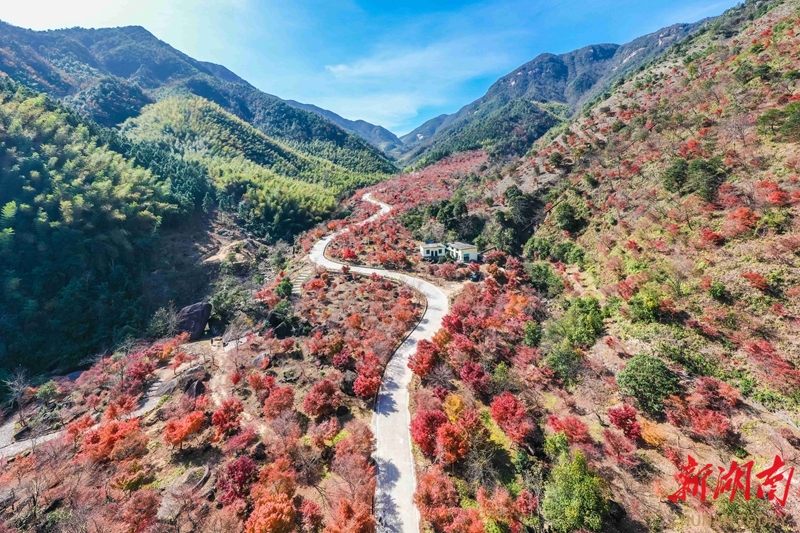 11月27日,蓝山县蓝山谷景区,枫叶渐染绚丽红色,将整个山谷装点得层林尽染,景色如诗如画。彭华 摄(湖南图片库)