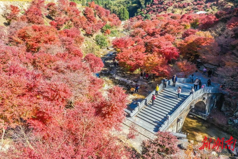 11月27日,蓝山县蓝山谷景区,游客在欣赏红枫美景。初冬时节,该景区的枫叶渐染绚丽红色,将整个山谷装点得层林尽染,景色如诗如画。彭华 摄(湖南图片库)