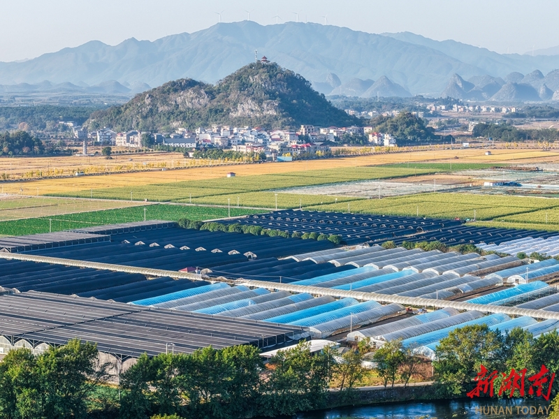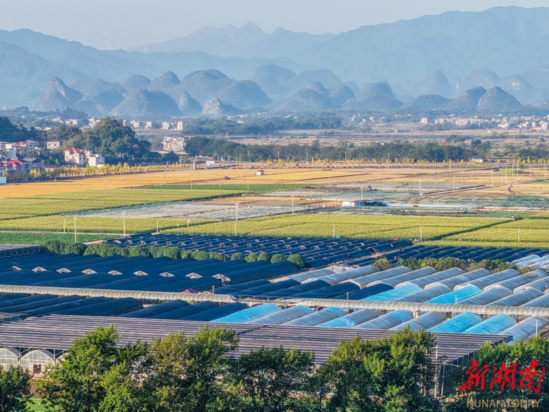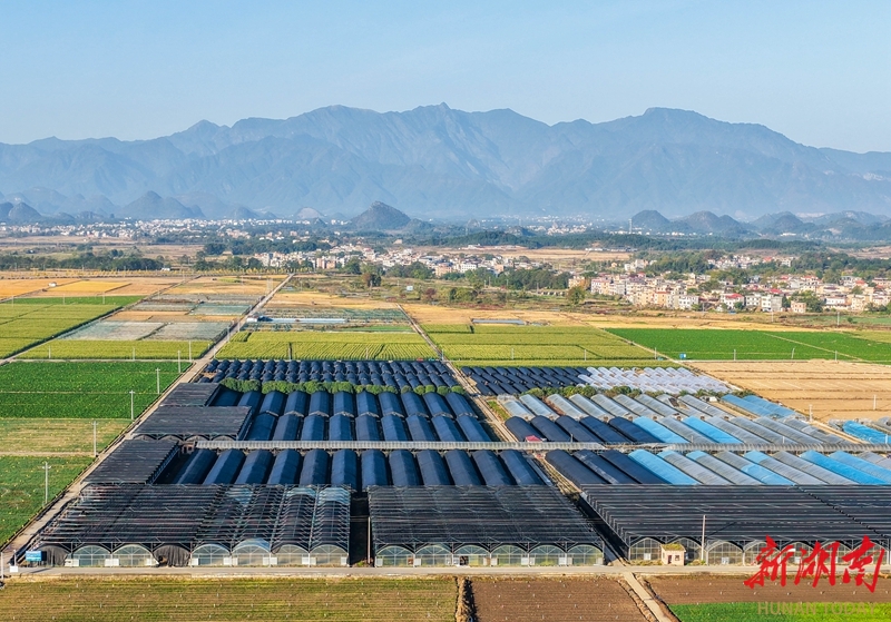 11月27日,道县清塘镇室家村,整齐的果蔬大棚、成片的高标准农田与民居、远山相映成景,构成一幅生机盎然的新农村画卷。蒋克青 摄(湖南图片库)