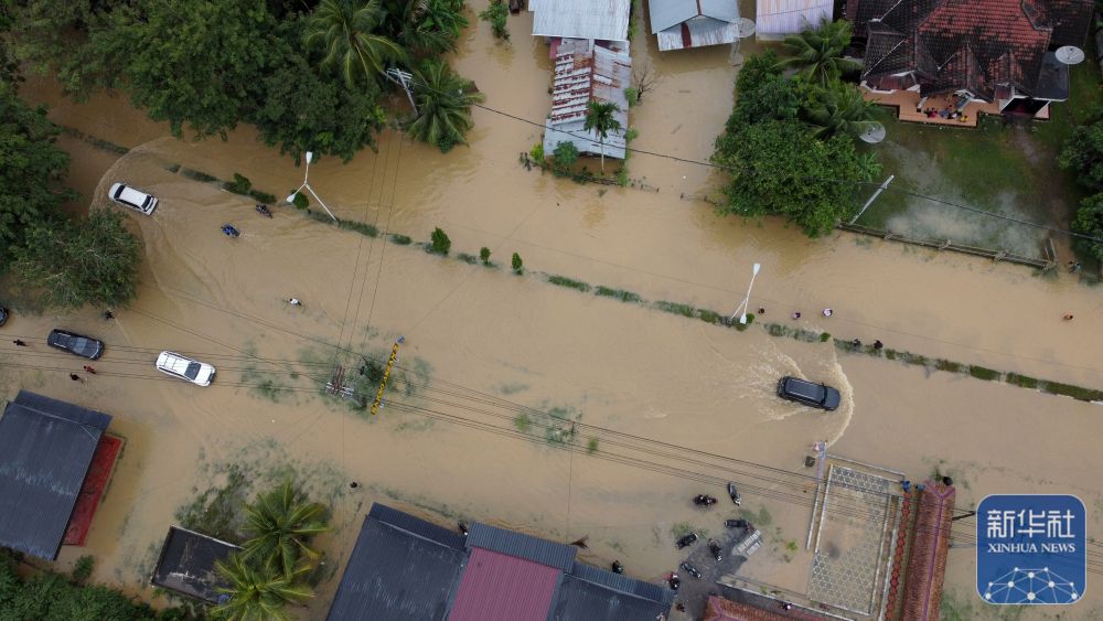 ↑这是11月27日在印度尼西亚苏门答腊岛亚齐省司马威拍摄的被洪水淹没的居民区(无人机照片)。新华社发(尤哈姆摄)