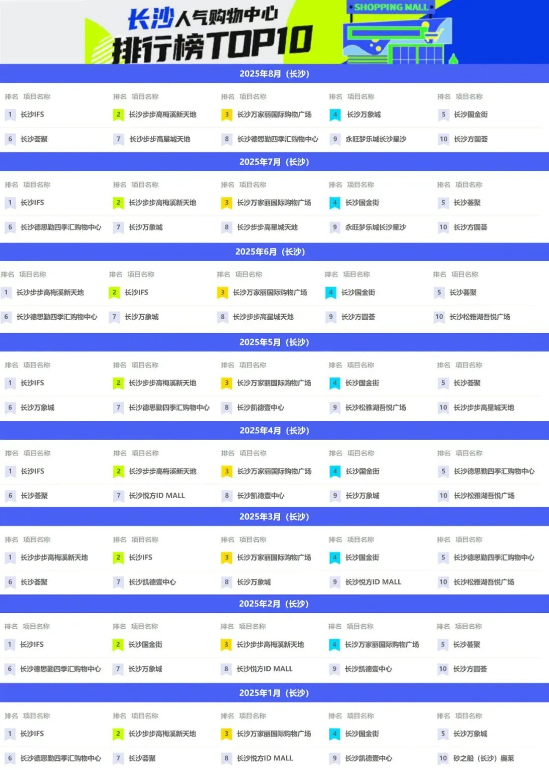 赢商股份2025年1-9月每月更新的《长沙人气购物中心排行榜TOP10》中,既有常年稳居前列的“常客”,也有轮番上榜的“黑马”,共同撑起长沙商业的热度。如长沙IFS、长沙步步高梅溪新天地、长沙万家丽国际购物广场、长沙国金街、长沙荟聚、长沙德思勤四季汇购物中心、长沙万象城等,都榜上有名。