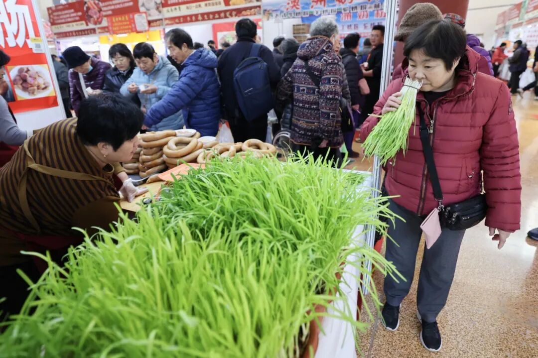 “我早上七点就赶过来了,就爱这种逛大集的感觉。”68岁的李阿姨拉着轻便购物车,里面装着干菜、香油和牛肉丸,“我不太会网购,这里能看能尝,价格还比超市便宜不少,走走路挑挑货,身子都暖和了。”