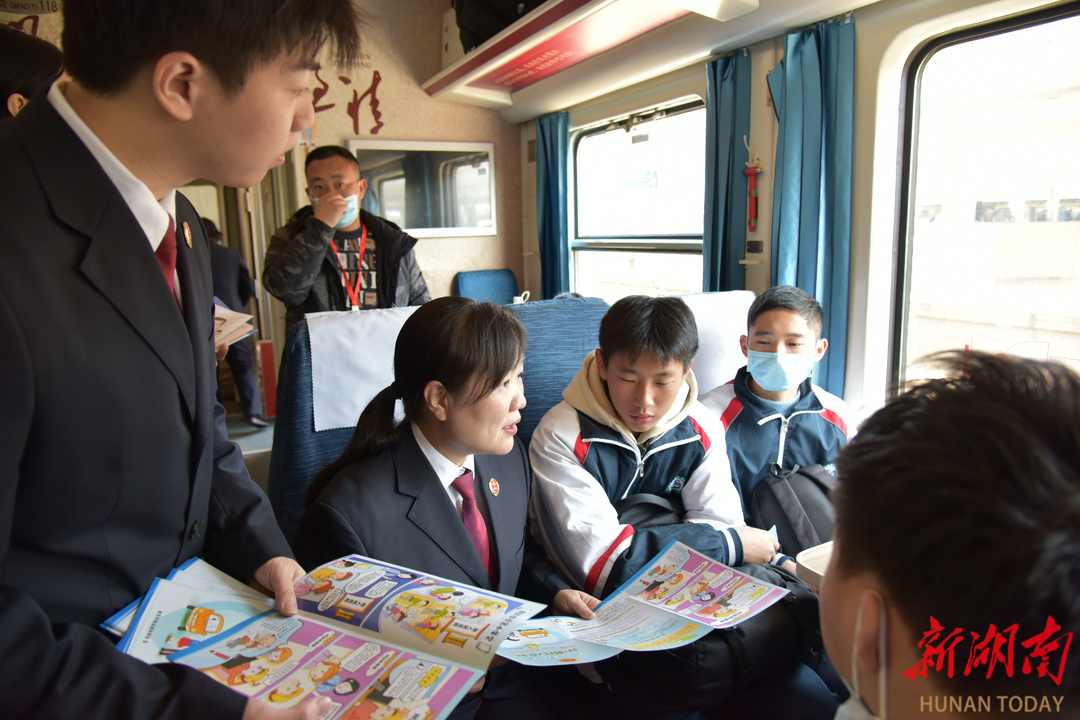 本周内,衡阳火车站每日开行“我的韶山行”红色研学专列。为确保师生出行顺畅、防范安全风险,衡阳铁检院积极响应,将志愿精准服务与法治宣传相结合,聚焦未成年人保护,传递检察关怀。