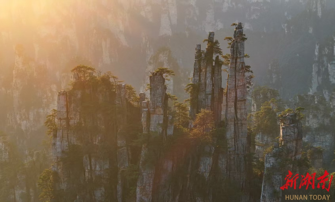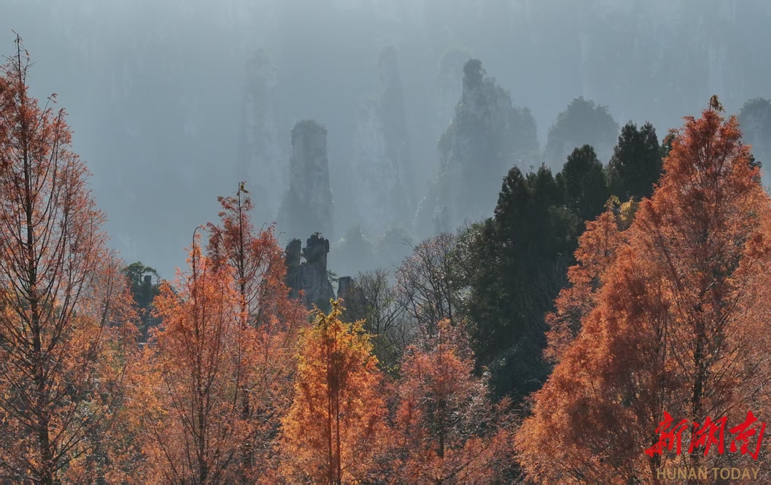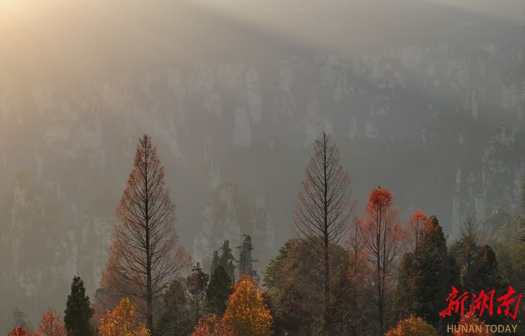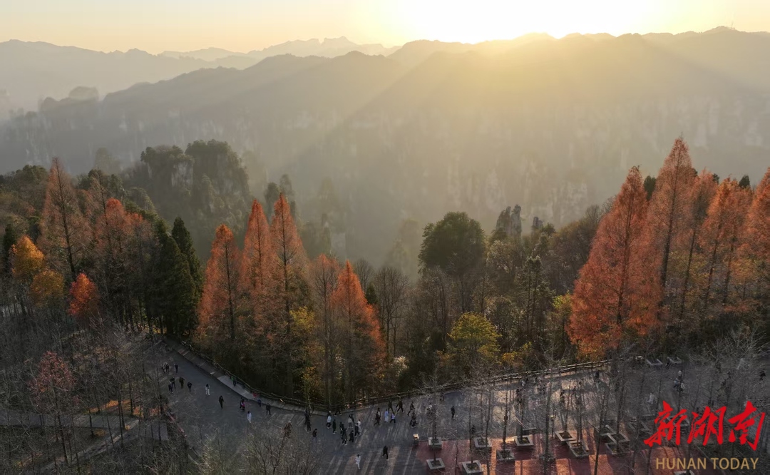 11月28日,冬日的湖南张家界国家森林公园天子山景区,层林尽染,夕阳辉映下的绵延峰林宛如一幅水墨丹青画卷映入眼帘,如梦如幻、美不胜收。通讯员 吴勇兵 摄影报道