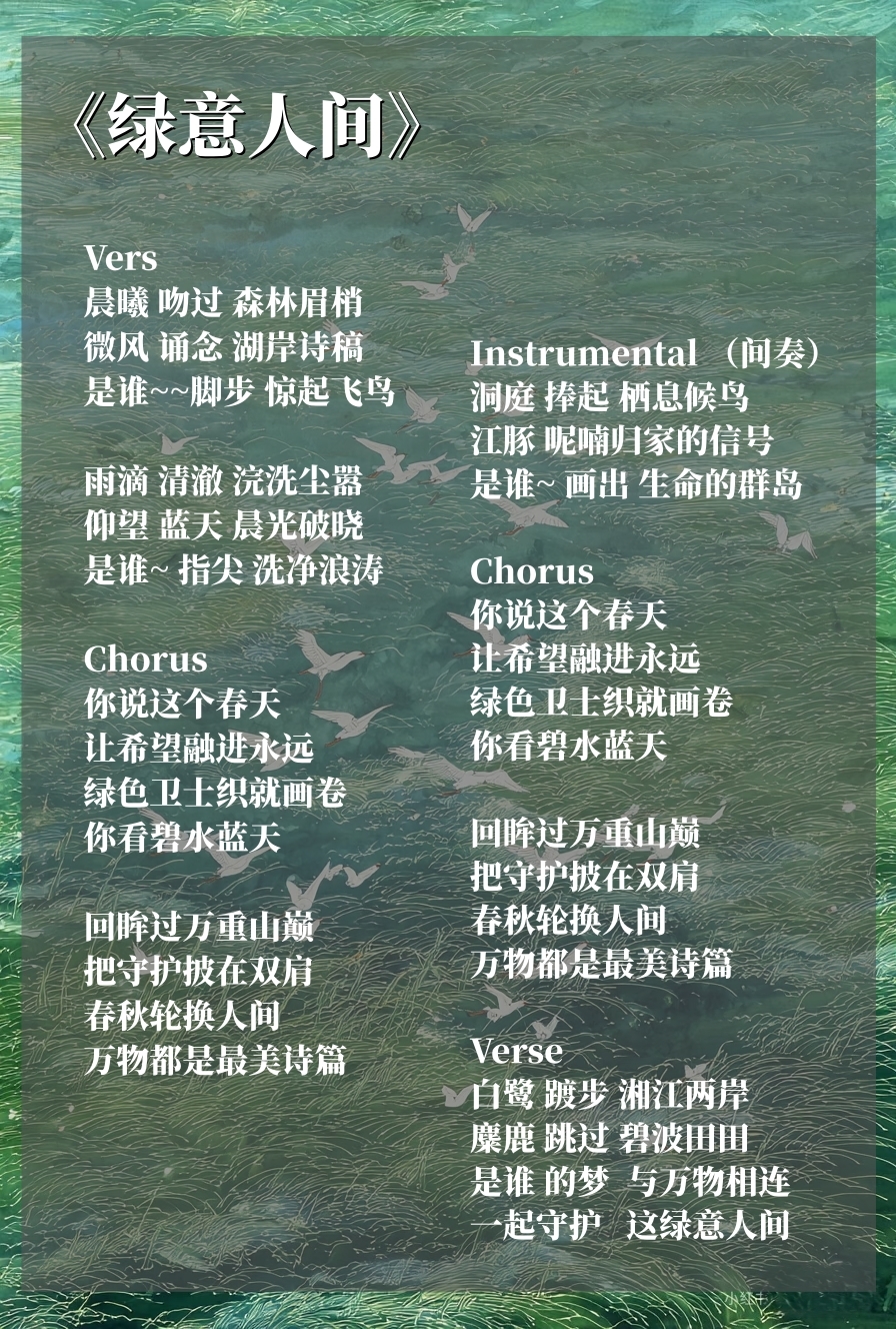 《绿意人间》融合了城市民谣与独立流行风格,创作团队从“绿色卫士”的志愿服务项目里选择了净滩巡河、爱鸟护绿、大气防护、生物多样性保护等内容,以极诗意化的词句融入四段主歌里——森林的眉梢、湖岸的诗稿、惊起的飞鸟、清澈的雨滴、破晓的晨光、栖息的候鸟、呢喃的江豚、踱步的白鹭、跳跃的麋鹿、生命的群岛……
