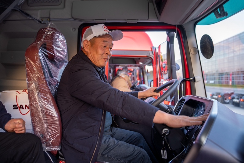 11月28日,长沙县三一智联重卡产业园,三一重卡举行第四批英雄车主免费换车仪式,为28位早期用户交付全新车辆。今年是三一重卡第四次开展免费换车活动。 图为车主在体验新车。 湖南日报全媒体记者 童臻熙 谢卓芳 摄影报道