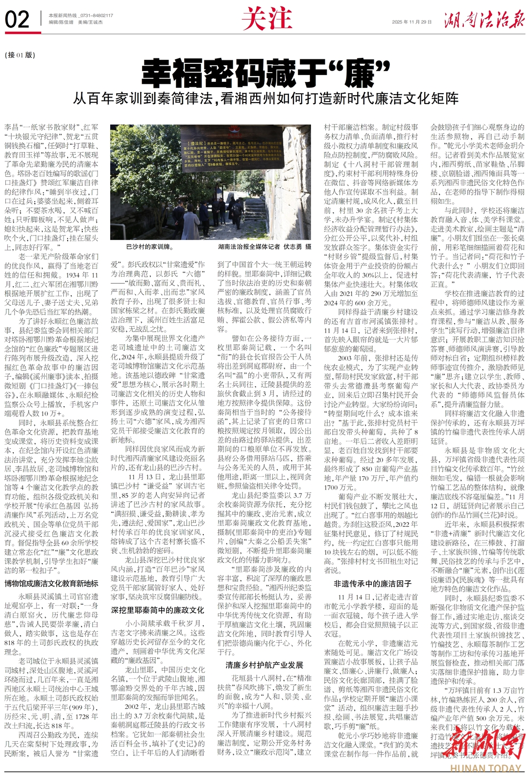 “十四五”以来,湘西州各级纪检监察机关深挖本地廉洁文化资源,将廉洁文化与红色文化、优秀传统文化、非遗传承等相融合,以永顺红色塔卧、龙山里耶秦简、花垣“十八洞村”等为廉洁地标,打造“一地一品”廉洁文化矩阵,使人们在耳濡目染中涵养清风正气,以清廉之风推动和保障社会与经济良性发展。一路走来,一张极具湘西州域特色的新时代廉洁文化地图在记者眼前徐徐展开。