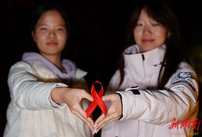 11月28日,南华大学“红丝带”防艾先锋队的志愿者们通过比心手势展示红丝带。曹正平 闫昶 摄影报道(湖南图片库)