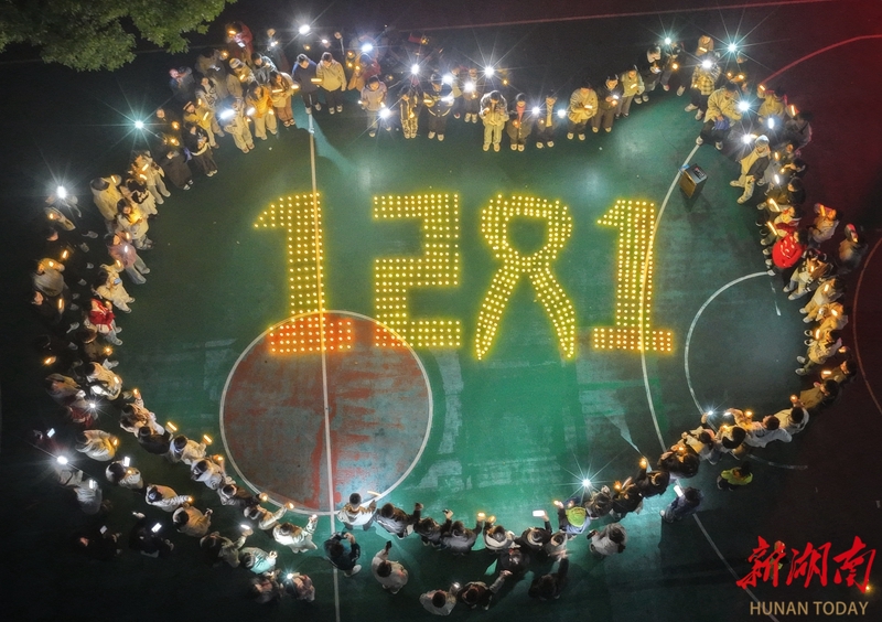 11月28日,在第38个世界艾滋病日到来之际,南华大学“红丝带”大学生防艾先锋队的志愿者们在校园举办为“艾”发光校园主题宣传活动,同学们在学校篮球场用烛光点亮“12.1”和红丝带的字样与图案,集体宣誓成为防艾志愿者,并向全体大学生发出“社会共治,守正创新,终结艾滋”倡议,呼吁广大青年大学生行动起来,守住原则线,向2030年终结艾滋病流行的目标贡献出青春的力量。曹正平 闫昶 摄影报道(湖南图片库)