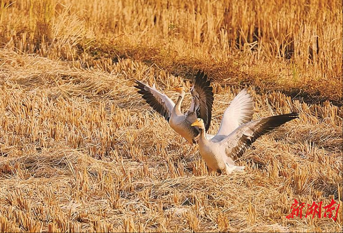 11月27日,在舂陵国家湿地公园洋市段江边稻田,记者看到这两只斑头雁正悠然地啄食禾苗根茎,姿态优雅。头部洁白,头顶至后颈点缀两道清晰的黑色横斑,橙黄色的喙和脚,这些独特的形态特征,让工作人员确认了这一珍稀物种便是斑头雁。