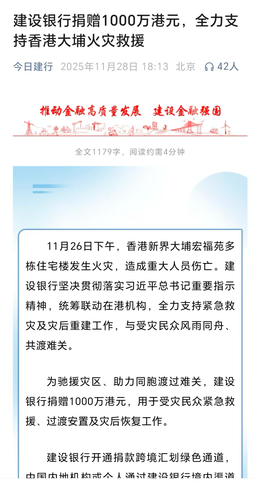 同日,农业银行发文称,携同在港机构将向香港受灾地区捐赠港币1000万元,专项用于支持火灾救援及灾后重建工作,助力香港受灾同胞早日恢复正常生活。灾情发生后,农业银行集团上下紧密联动,统筹推进各项援助措施。农行香港分行联络合作公益组织,向受灾家庭进行专项捐赠,组织义工队伍投入救灾支援;与在港保险公司保持密切沟通,明确金融支持,助力大埔火灾保险理赔;同时与香港特区政府相关房屋管理机构联系,持续关注灾后重建计划,及时提供金融支持。农银国际积极组织员工开展义务献血。农银财险第一时间启动客户出险排查,主动联系慰问受灾客户,并推出服务绿色通道、简化理赔程序、提供人文关怀等一系列服务举措,全力保障受灾民众权益。
