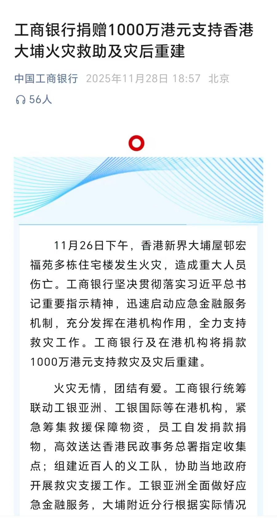 11月28日,工商银行发文称,工商银行及在港机构将捐款1000万港元支持救灾及灾后重建。工商银行统筹联动工银亚洲、工银国际等在港机构,紧急筹集救援保障物资,员工自发捐款捐物,高效送达香港民政事务总署指定收集点;组建近百人的义工队,协助当地政府开展救灾支援工作。工银亚洲全面做好应急金融服务,大埔附近分行根据实际情况延长服务时间,并按照“特事特办、急事急办”原则,设置专属服务窗口,为受影响的客户提供无卡取现、快速补卡等便利,统筹安排贷款展期、减免利息和定期存款提前支取免手续费等一揽子举措,着力满足受灾民众的金融需求。
