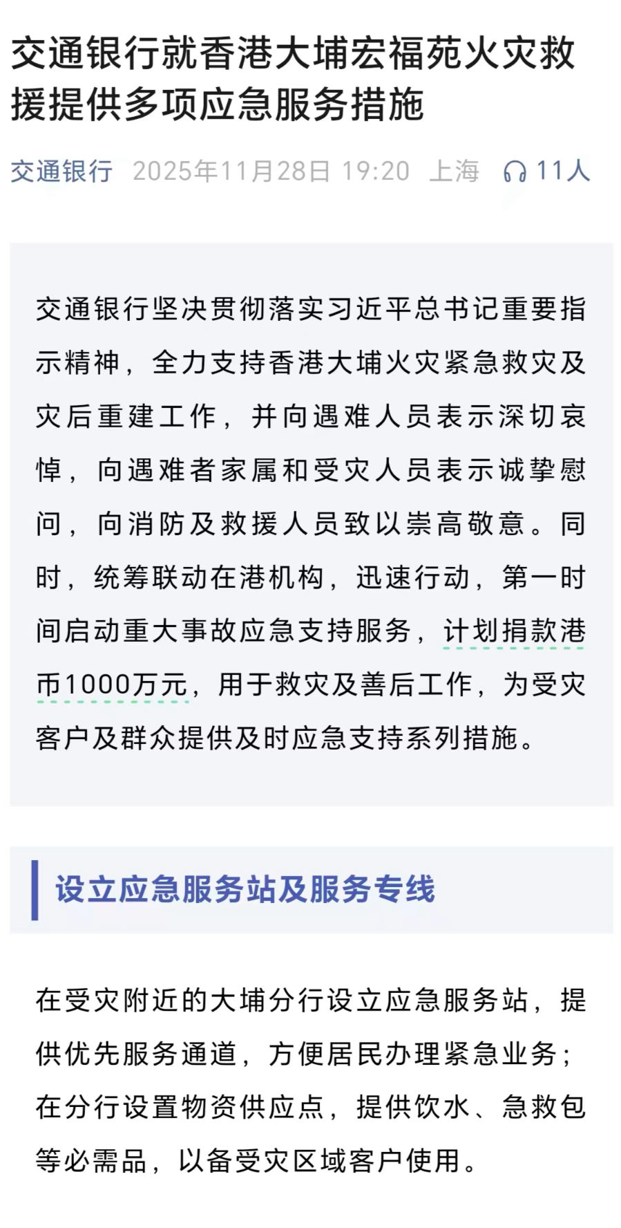11月28日,交通银行发文称,计划捐款港币1000万元,用于救灾及善后工作,为受灾客户及群众提供及时应急支持系列措施。在受灾附近的大埔分行设立应急服务站,提供优先服务通道,方便居民办理紧急业务;在分行设置物资供应点,提供饮水、急救包等必需品,以备受灾区域客户使用。