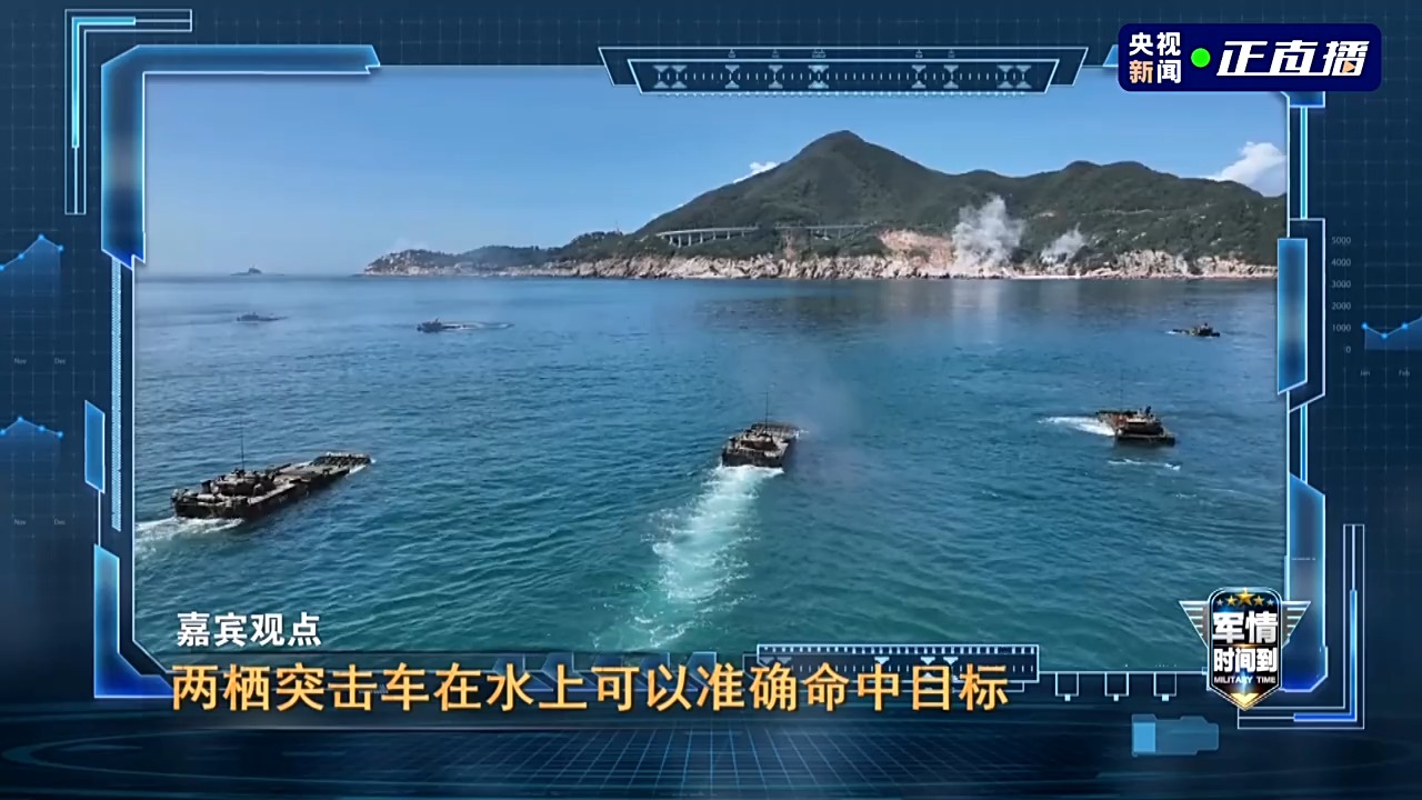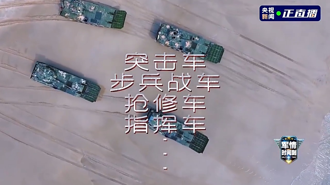 总台军事观察员 魏东旭:05式两栖装甲车确实是一个车族,首先要跑得快,也要游得快。因为它离开了船坞登陆舰,离开了坦克登陆舰之后,要依托于自身的动力和比较独特的外形,可以进行快速地泛水。所以我们大屏幕上的照片看到的就是它要冲向滩头阵地的状态,就是因为动力系统升级了,而且进一步地优化了它的外形,它在海上高速航行的时候,可以使用火炮,针对对方防御阵地上的目标进行精准的火力打击,所以在这种状态下能够打中标,这是非常不容易的,边游边打、边跑边打,可以有效地撕开对方的岸防阵地,即使和对方的主战坦克正面较量,它也有放手一搏的能力。除了我们刚才提到的05式两栖突击车,还有05式两栖步战车,炮塔上配备的是30毫米口径的激光炮,两侧也有反坦克导弹,还可以在载员舱当中搭载作战人员,不仅可以进行火力支援,同样,当05式两栖步战车到达滩头阵地之后,战士就可以更好地配合装甲作战平台,针对阵地进行夺控。同样,也可以实现作战人员和车辆进行联合作战。