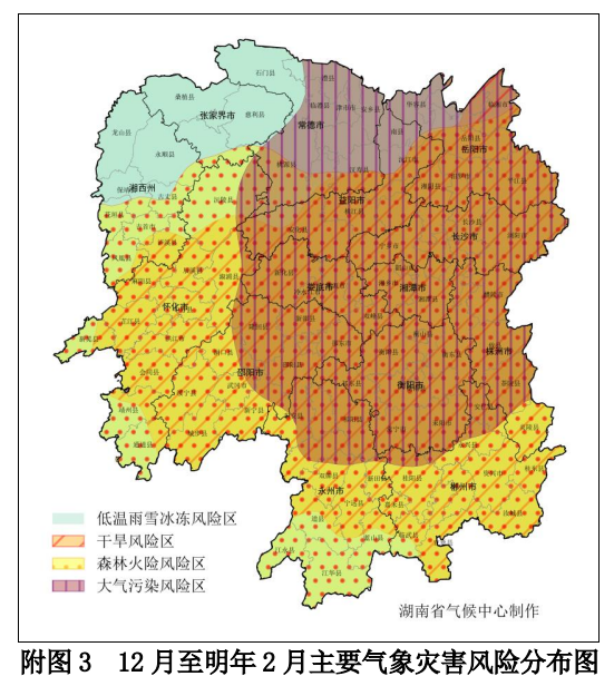 预计今年冬季(12月至明年2月)湖南总体降雨偏少,气温偏高但起伏大,大部分地区有干旱灾害风险,需加强水资源管理,并做好高森林火险等级和重污染天气防范应对工作;明年1月下旬至2月中旬有轻到中等强度的低温雨雪冰冻天气发生,需提前防范对交通安全、城市运行、能源保供以及重大工程建设的影响。
