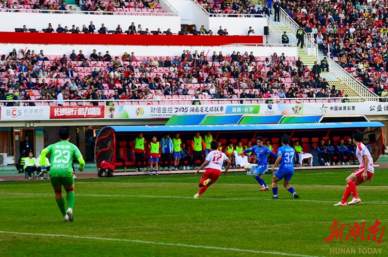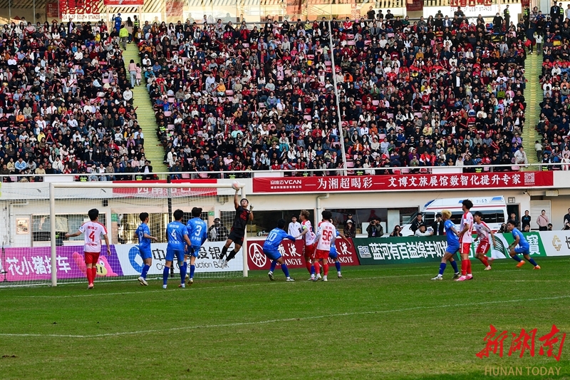 11月29日,长沙贺龙体育中心,双方球员在比赛中展开激烈拼抢。当天,湘超联赛第十二轮比赛,长沙队主场迎战怀化队。最终,长沙队4比1战胜怀化队。潘雨 摄(湖南图片库)