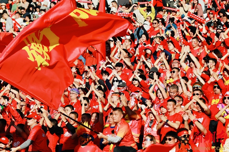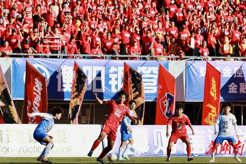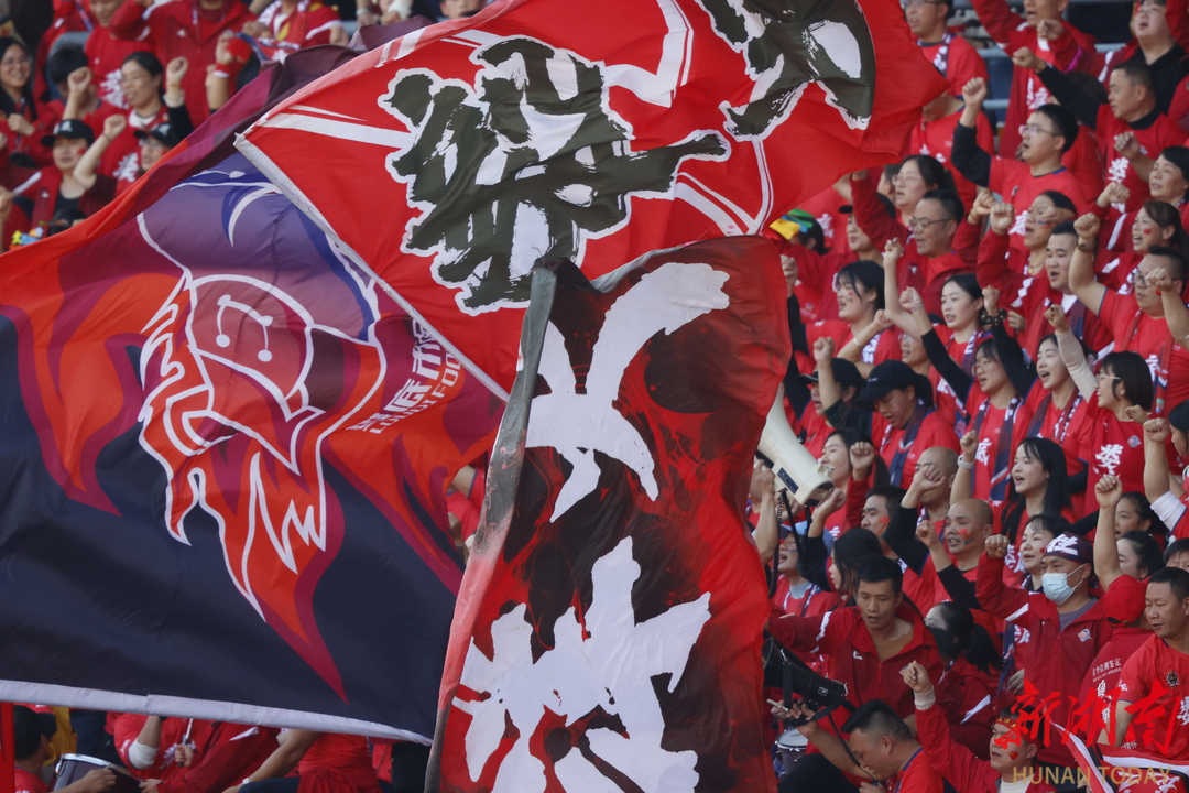 11月29日,衡阳市体育中心,球迷在加油助威。当天,湘超联赛第十二轮比赛,衡阳队主场迎战娄底队。最终,衡阳队0比2不敌娄底队。罗茂盟 摄(湖南图片库)