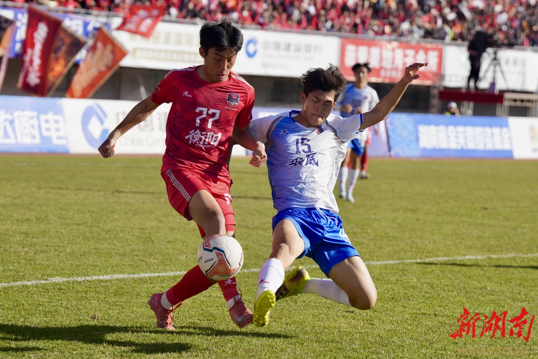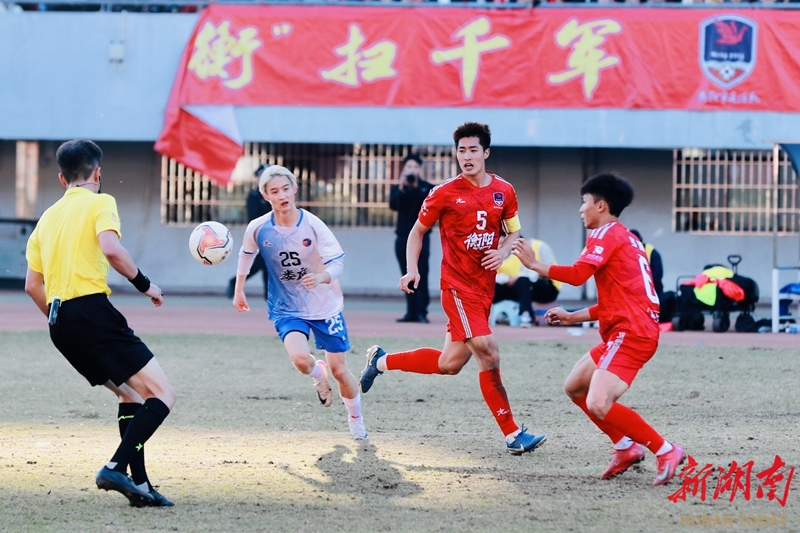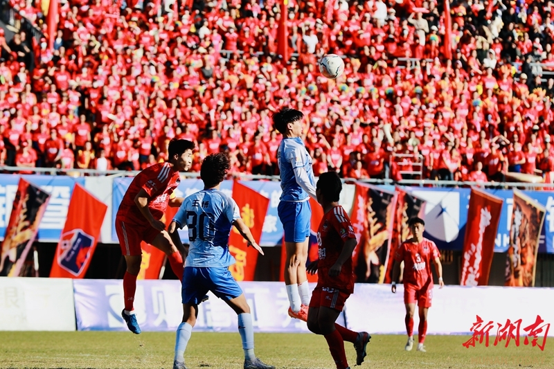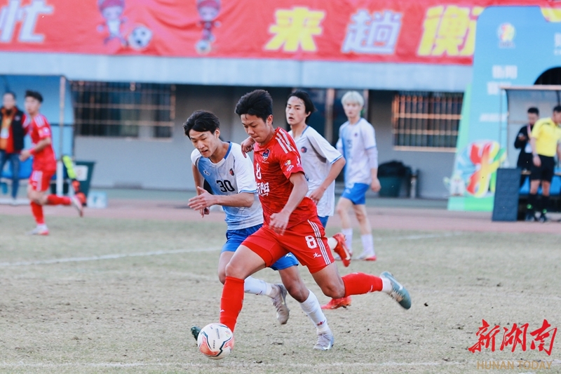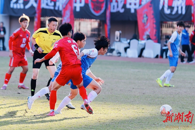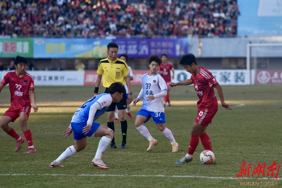 11月29日,衡阳市体育中心,双方球员在比赛中展开激烈拼抢。当天,湘超联赛第十二轮比赛,衡阳队主场迎战娄底队。最终,衡阳队0比2不敌娄底队。周文晋 摄(湖南图片库)