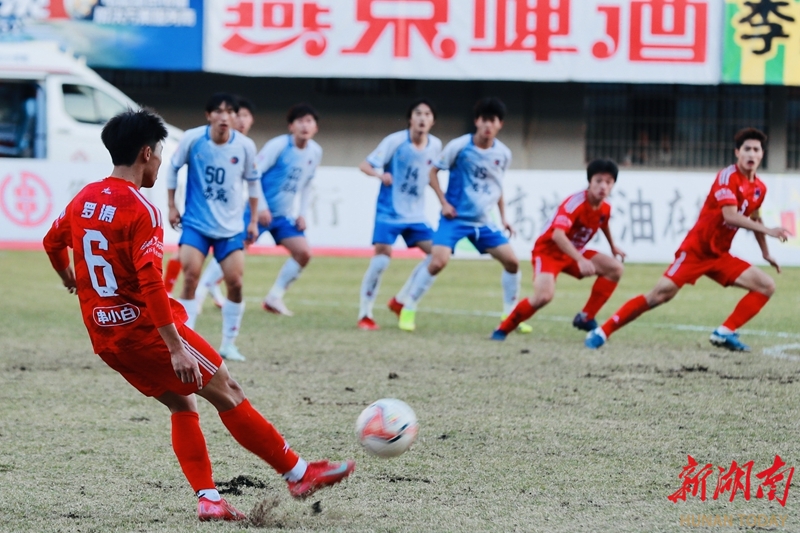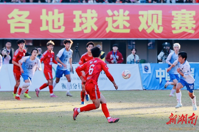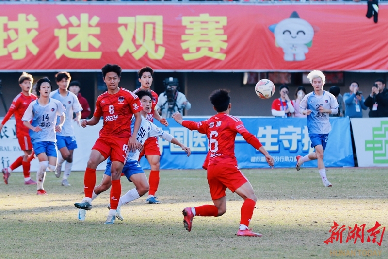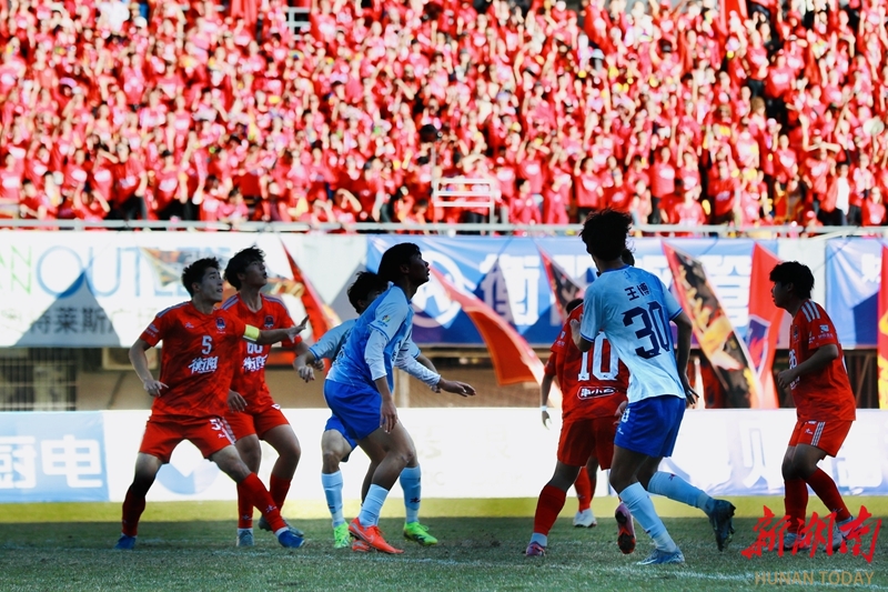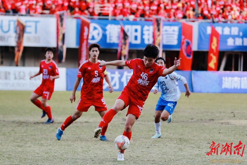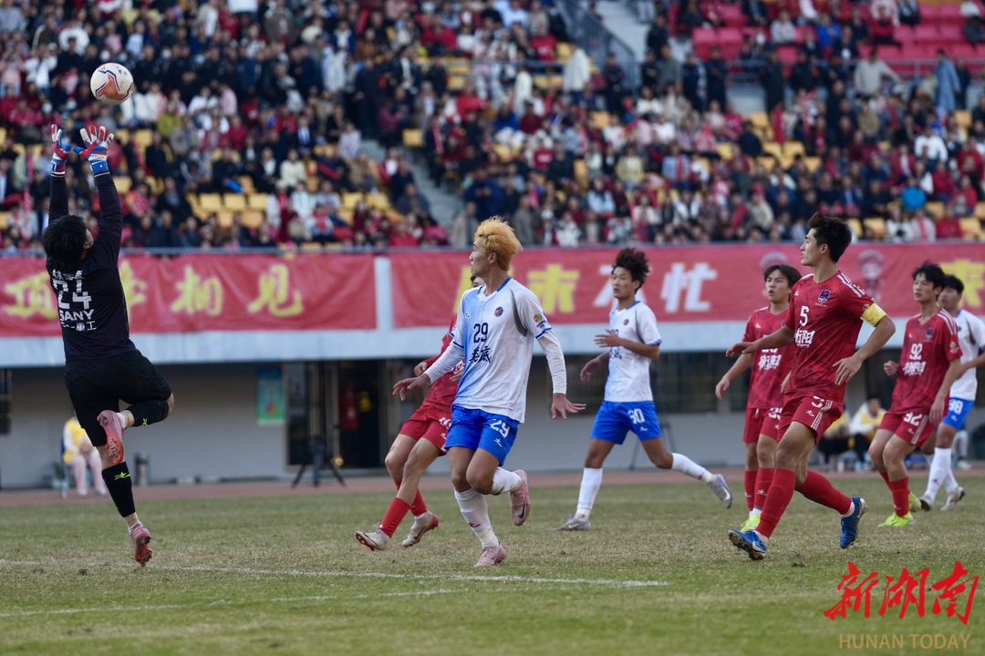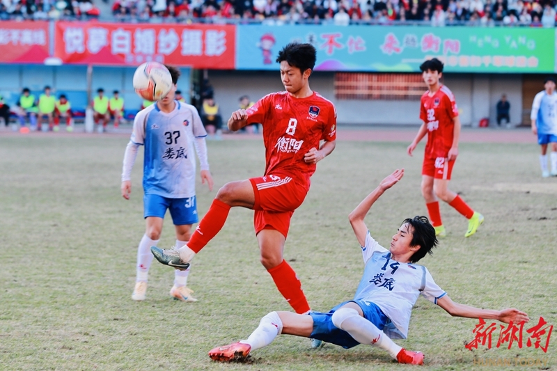 11月29日,衡阳市体育中心,双方球员在比赛中展开激烈拼抢。当天,湘超联赛第十二轮比赛,衡阳队主场迎战娄底队。最终,衡阳队0比2不敌娄底队。周文晋 摄(湖南图片库)