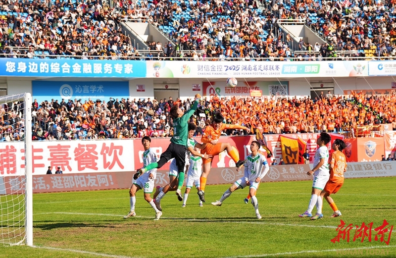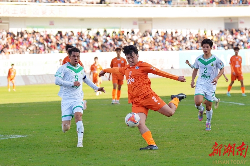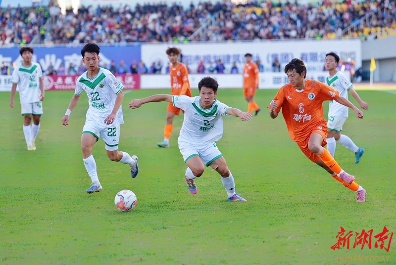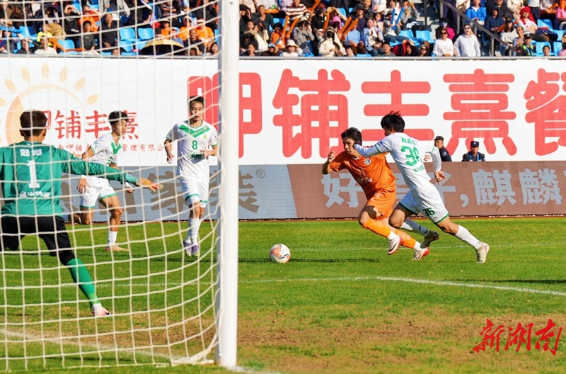 11月29日,邵阳市体育中心,双方球员在比赛中展开激烈拼抢。当天,湘超联赛第十二轮比赛,邵阳队主场迎战郴州队。最终,邵阳队1比1战平郴州队。申兴刚 摄(湖南图片库)