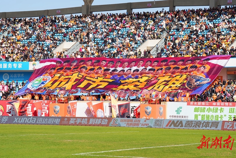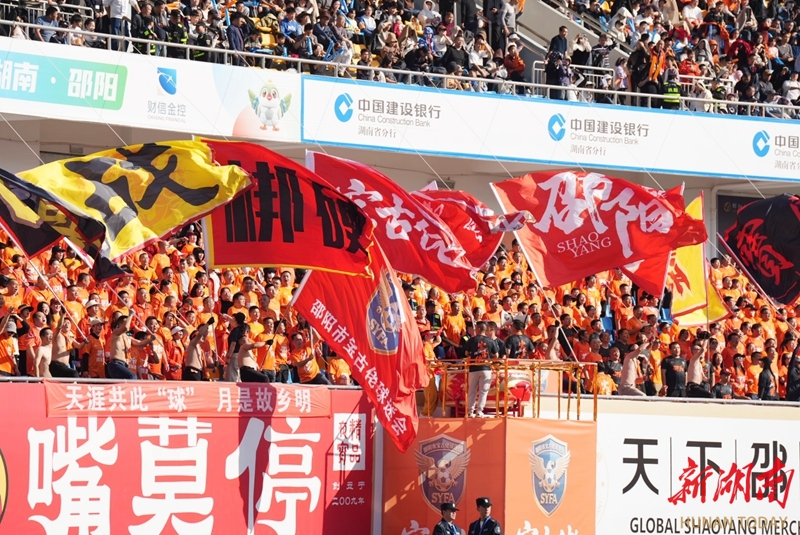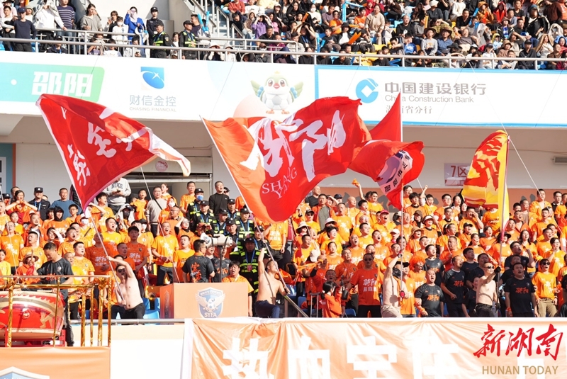 11月29日,邵阳市体育中心,球迷在加油助威。当天,湘超联赛第十二轮比赛,邵阳队主场迎战郴州队。最终,邵阳队1比1战平郴州队。申兴刚 摄(湖南图片库)