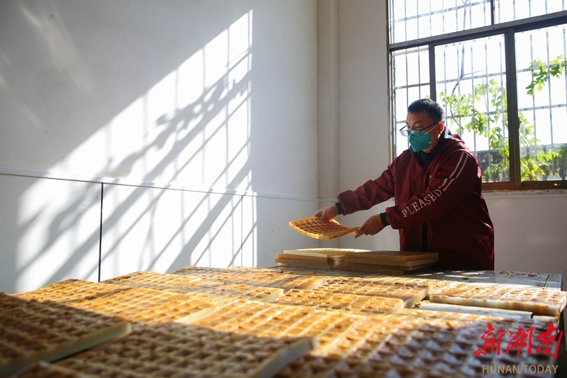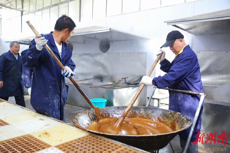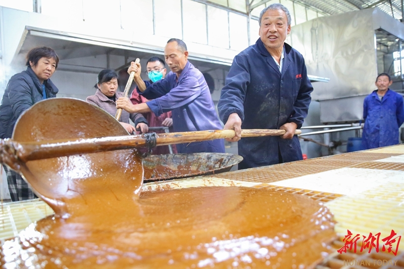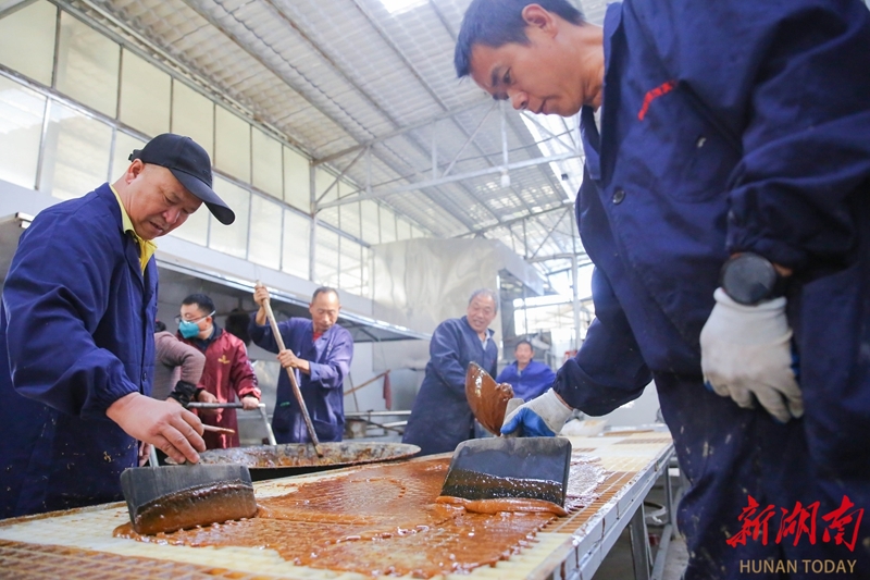 11月29日,隆回县山界回族乡老屋村,工人将熬好的红糖装盘冷却。曾勇 孙中坤 摄影报道(湖南图片库)