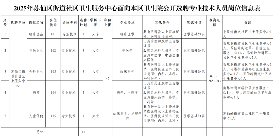 1.计划选聘专业技术人员10名,具体选聘单位、岗位、计划数及资格条件等详见《2025年苏仙区街道社区卫生服务中心面向本区卫生院公开选聘专业技术人员岗位信息表》(附件1,以下简称《岗位信息表》)。