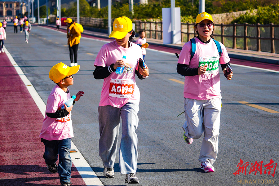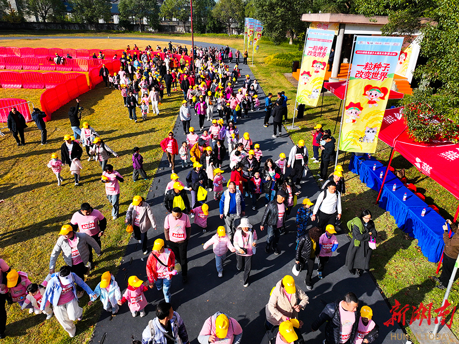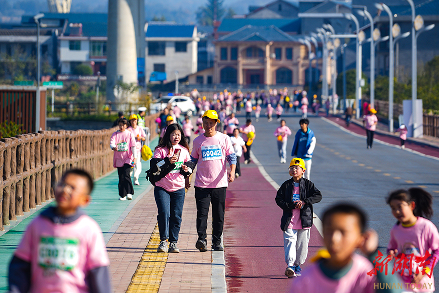 11月30日,“湖南走娃少儿健走大赛” 走进“世界稻都”洪江市安江镇——杂交水稻的发源地。来自省内各地的800余组家庭、近2000名儿童及家长,身着粉色T恤齐聚于此,踏上这条沉浸式徒步路线,在稻香与秋色中,完成一场身体与心灵的双重行走。 周嘉晨 摄(湖南图片库)